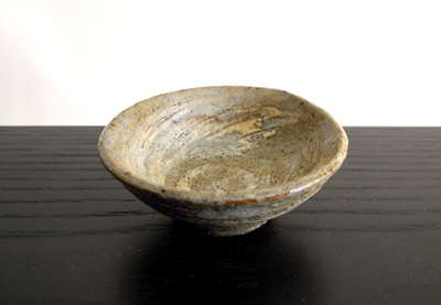 ところで、肝心のぐい呑みであるが、写真のとおり小振りで、下戸に近い私には丁度良い大きさである。形は平茶碗のように浅く、飲み口としたのか、口の一部に歪みをもたせている。器には刷毛による白泥の渦巻き模様がくっきりと見て取れる。器にお酒が入ると、小さい器の中にまるで「鳴門の渦」を見ているようで、酒量に影響を与えそうである。私は珍しい日本酒が手に入ったときなどこの器を使うことにしている。器には一つだけ残念なことがある。それは写真の通り僅かにニューが見られる。勿論、器を愛する者にとっては、古いものであり、この程度の傷は許される範囲なのかもしれない。