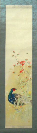 私の細やかな所蔵品には、数は少ないが掛け軸も含まれる。その中に「北上聖牛」作の花鳥画がある。図柄は振り返った雉子を背の高いつつじの木と熊笹の中に配置した構図である。熊笹は葉が冬に緑が枯れて白く隈取りをしたように描かれており、制作地は不明ながら、時期的には五月頃と推測している。つつじは二分咲き程度で蕾が目立つが、背丈はあり、一般家庭の庭で鑑賞している種類とは異なるようだ。肝心の雉子は瞳の表現を小さい黒い点としたためか眼光に鋭さは見られない。しかし、全身を覆う羽毛は、光線によって黒色にも見えるなどの特長を微妙にとらえ、顔の周囲に肉だれは見られないが真っ赤に描かれ、首までは群青色、腹部は群青色から緑色などに変化する羽毛を丁寧に描写している。さらに仔細にみると、名前は分からないが、青色の小さな花や黄色の花も描かれている。日本人は余白に拘りがあるようで、この絵も上部に十分な余白を持たせ、一方、下部は込み入った構図のため、全体としてバランスが取れた構図に思える。