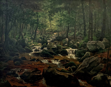 画家の事はさておき、作品を見ることにしよう。絵は源流に近い渓流を描いたと思われる。構図は水量の少ない水の流れが、苔むした大小様々な岩の隙間を縫うような情景が目に飛び込んでくる。画面下部には形の異なる大きな岩が左右に配置され、岩の存在感か迫って来た。私が驚いたのは、苔むした岩の表情や陰影の巧みさ、透けて見える浅い川底の心憎い描写である。渓流の両岸には、杉や松らしき樹木が、なだらかな斜面上部に向かって岩場に自生している状況を巧みに描写し、まるで深い森に迷い込んだような雰囲気さえ感じる。さらに追い打ちをかけるように、樹木の根元周辺の木漏れ日がさしている下草や岩も、隅々まで手を抜くことをしない細密描写である。私は画面を見て、直ぐにこの画家は遠近法を熟知していることに気付いた。それは四方から交わる周辺は、陽がさしていると思われ、明るく表現し、鑑賞者の視線が自然に交差する場所に誘導されることを意識しているようだ。因みに、私が絵を買い求める決断をしたのは、目の前の景色を画家と一緒に見ているような錯覚(寧ろ臨場感かも?)を起こしたことが決め手になったと記憶している。