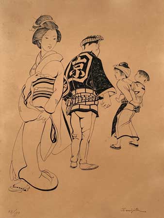 私は蒐集家の端くれとして、以前から藤田の版画作品に注目してきた。私の拘りは、巷でよく目にする外国人女性像などの版画ではなく、存在するかどうかわからない珍しい作品をいつの間にか追い求めてきたようだ。しかしながら、現実は厳しいもので、気になる藤田の版画は、どれも私の購入できる価格を超えており、その都度諦めざるを得なかった。それでも、1点は所蔵したい思いを持ち続けた結果、今回の出合があったと感じている。