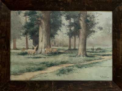 その後、数年経過したころ一枚の古い風景画(水彩)に出合った。これが自分で言うのも憚れるが、一目でノックアウトを食らったような衝撃を受けた。一見してパステル画ではと見紛う印象もあったが、実際は観る者の感情を揺さぶる水彩画であった。作品は杉林の中で草を食む鹿の群れを臨場感あふれる表現で描いており、画面からは鑑賞者の心に自然に響いてくる心地よさを感じた。具体的な構図を見ると、杉の木の位置関係を考慮した配置、幹の大小、鹿の群れの配置の良さ、さらには朝もやの描写は、自分がその場に居合わせているような錯覚さえを起こしそうである。絵に近づいてみると、群れのリーダーと思しき一頭は、仲間が草を食んでいる間、周囲を警戒している様子が、作者の技量によって見事に活写されている。他にも二本の杉の大木やS字型の小道、更には一目で遠近感がわかる奥の草地の描写など枚挙に暇がない。私の数少ない所蔵品の中でも上位の逸品である。