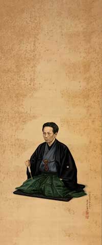 人物像は140年近く経過していることもあり、全体にシミも見られるが、肝心の人物はシミもなく綺麗な状態で、今描き上がったと見紛う程である。モデルは男性で、羽織袴姿で正座し、斜め45度の左方向を見ている。右手で扇子の先端部分を握り、右膝の上に立てているポーズを画家がとらせたものと思われる。仔細に見ると、左手は袴の中に入れ、見逃していたが、濃紺と思える羽織と同系色の座布団に座っていた。羽織には家紋が描かれるなど肖像画の約束事を守っているようだ。説明が重複するが、肖像を描くときの小道具として、人物に扇子を持たせる工夫も見て取れる。「五姓田のすべて」展に15点程の羽織袴姿の男性像が展示されていたが、うち4人の男性にも右手に扇子を持たせていた。おそらく身動きせずにじっとしていることに不慣れなモデルに安心感を与える心遣いであったのだろう。最後に顔を見ると、口の周りの髭のそり後やほうれい線、鼻、口元などの陰影の描写は生き人形のように生々しい。髪も多く、額も広めの顔立ちで、意志の強そうな50代と思われる男性像を瞳の入れ方一つで表現したと感じている。