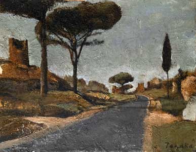作品にはカンヴァス木枠に「47、9、24、 アッピア街道」と書き込みがあることから、田中が昭和47年に欧州のどこかを旅行の際に制作したものと思われる。因みに欧州旅行未経験の私は、アッピア街道と言われても場所さえ見当がつかない。さっそく手元資料を調べてみると「古代ローマの主要街道の一つで、ローマと南イタリアを結ぶ最初の舗装道路。BC312年監察官アッピウス クラウディウスにより建設され現存する。(学研 新世紀大辞典1968年発行)」とあり、田中は最初からこの場所を描くために目的地に選んだ可能性が高いと考えている。
